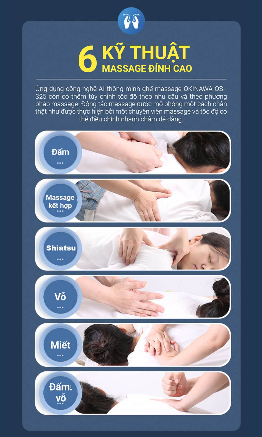 6 kỹ thuật massage ứng dụng công nghệ nhân tạo AI thông minh gồm các động tác massage như: Đấm, massage kết hợp, shiatsu, vỗ, miết, đấm – vỗ có thể tùy chỉnh tốc độ theo nhu cầu và phương pháp massage phù hợp với mọi lứa tuổi. Động tác massage được mô phỏng một cách chân thật như bàn tay chuyên viên massage đang thực hiện và có thể điều chỉnh tốc độ nhanh chậm dễ dàng.