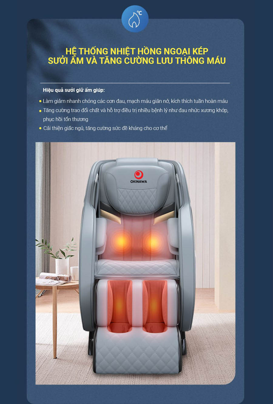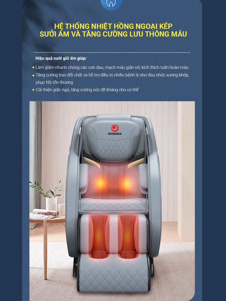 Hệ thống nhiệt hồng ngoại kép có hiệu quả sưởi ấm kết hợp với các bài tập massage hỗ trợ giúp cho các cơn đau giảm nhanh hơn, mạch máu giãn nở, kích thích tuần hoàn máu. Nhiệt nóng này góp phần giúp tăng cường trao đổi chất và hỗ trợ điều trị nhiều bệnh lý như đau nhức xương khớp, phục hồi tổn thương. Một lợi ích nữa là hệ thống nhiệt hồng ngoại kép giúp cải thiện giấc ngủ, hỗ trợ tăng cường sức đề kháng cho cơ thể.