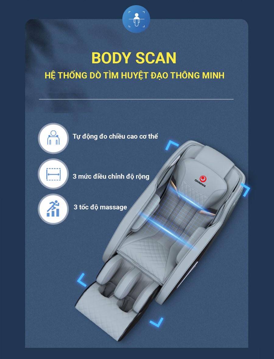 Chức năng body scan giúp dò quét cơ thể điều chỉnh độ rộng ghế về kích thước vừa vặn với người ngồi với 3 mức điều chỉnh và dò tìm huyệt đạo thông minh giúp tự động đo chiều cao cơ thể của người sử dụng. Ngoài ra OKINAWA OS – 325 đưa ra liệu trình massage phù hợp với từng thể trạng người dùng.