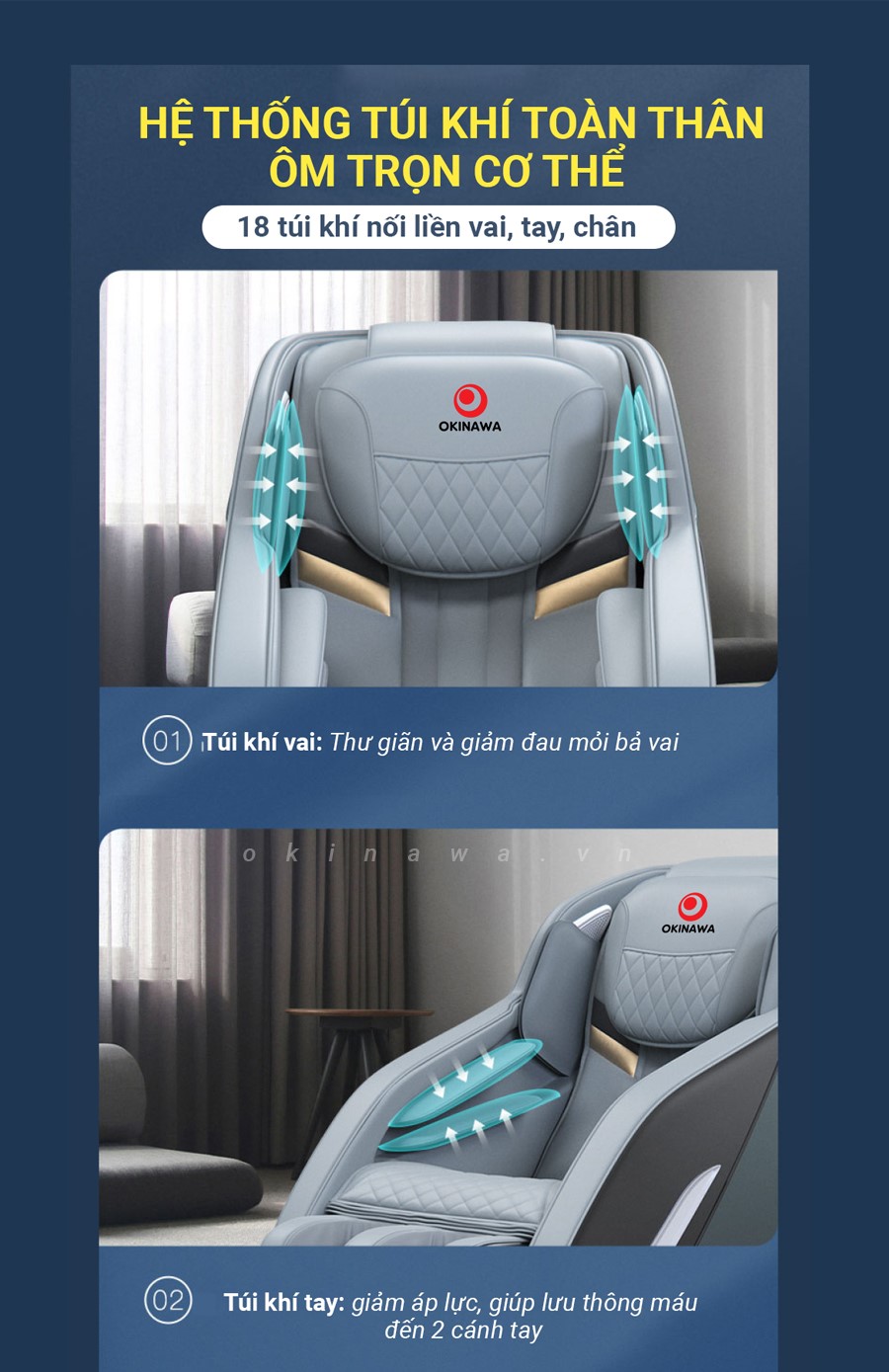 Ghế OKINAWA OS – 325 có hệ thống 18 túi khí nối liền vai, tay, chân tiếp xúc ôm sát giúp hỗ trợ thư giãn, giảm đau mỏi bả vai, hỗ trợ giảm áp lực, giúp lưu thông máu đến 2 cánh tay, hỗ trợ thư giãn các bó cơ và hỗ trợ cải thiện chức năng vận động ở chân.