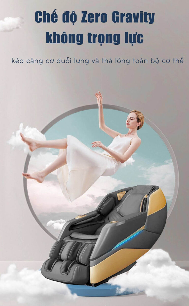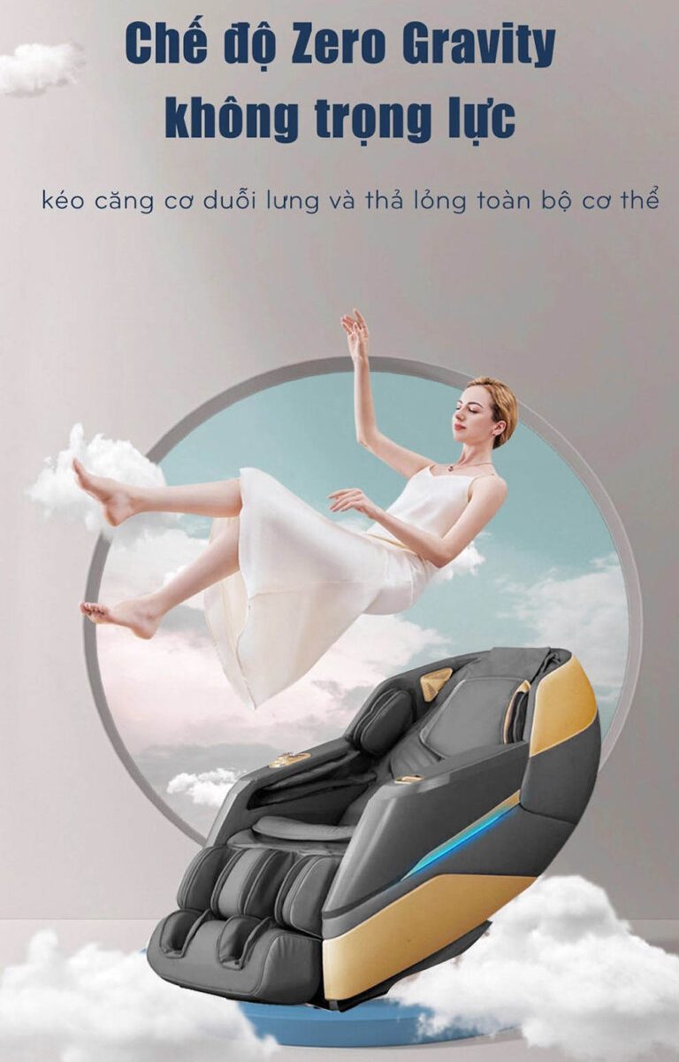 Chế độ không trọng lực cho người dùng cảm giác đang ở không giác vũ trụ với công nghệ mô phỏng góc nghiêng hoàn hảo của phi hành gia. Tính năng kéo căng cơ, duỗi lưng và thả lỏng toàn bộ cơ thể giải phóng tối đa áp lực lên cột sống sau 1 ngày dài. Đây cũng là tính năng đỉnh cao của ghế khi mà cả cơ thể của bạn được xoa bóp toàn bộ một lần.