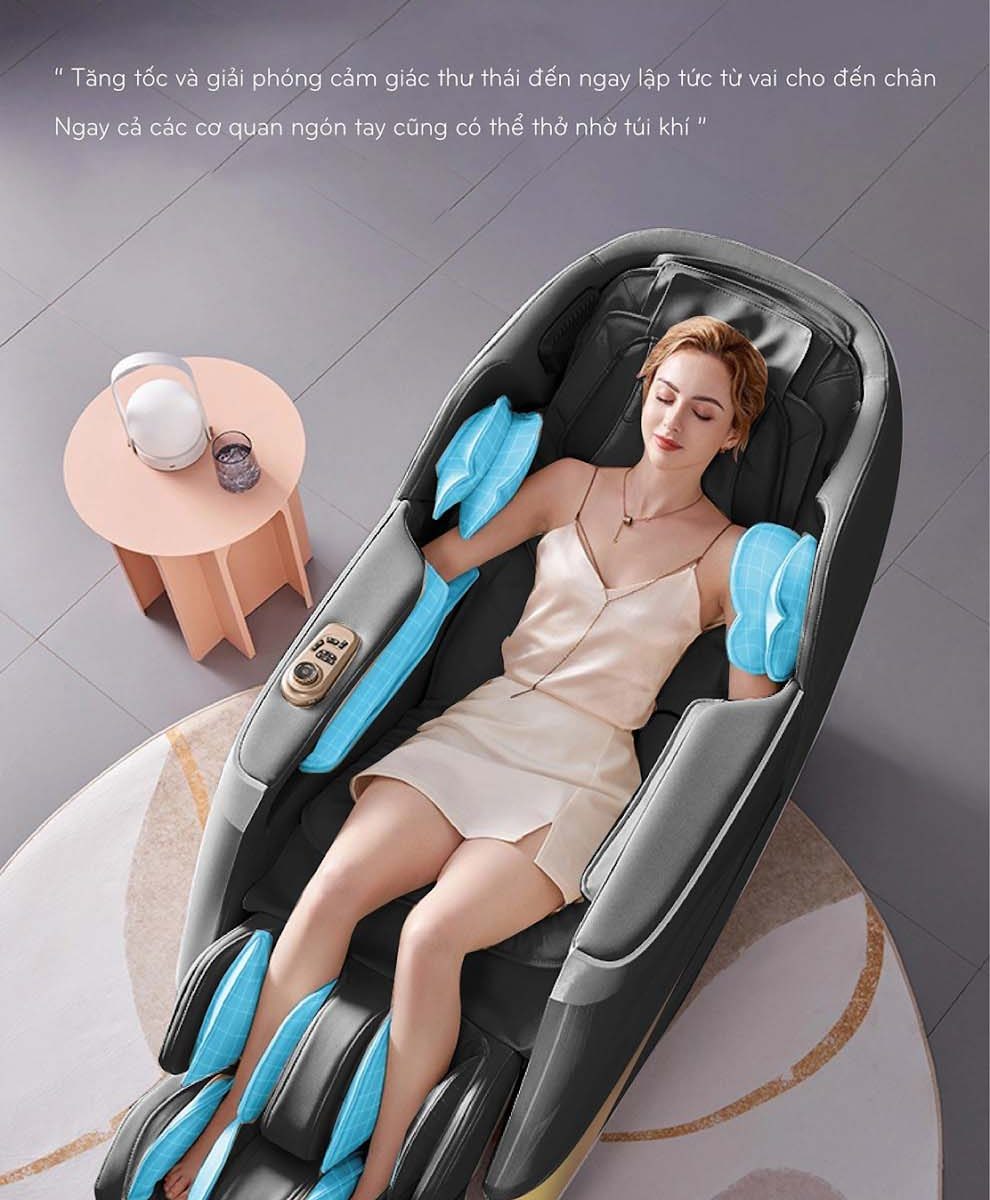 Túi khí có chức năng tăng tốc, giải phóng và mang đến cảm giác thư thái đến ngay lập tức từ vai cho đến chân, ngay cả các cơ quan ngón tay cũng có thể thở nhờ túi khí hỗ trợ giảm các cơn đau nhức, mệt mỏi, góp phần thư giãn sau ngày dài làm việc.