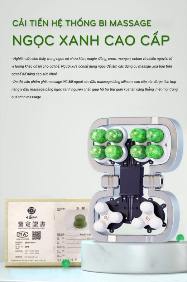 Ghế massage OKINAWA OS – 888 ngoài các đầu massage bằng silicon cao cấp còn tích hợp riêng 8 đầu massage bằng ngọc xanh nguyên chất giúp hỗ trợ người dùng thư giãn xua tan mệt mỏi, căng thẳng trong khi massage. Hệ thống bi massage ứng dụng ngọc trong sản phẩm là vì nghiên cứu cho thấy trong ngọc có chứa các chất như kẽm, đồng, magie, crom, mangan, coban và nhiều nguyên tố vi lượng có lợi cho cơ thể.