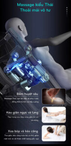 Công nghệ massage kiểu Thái được tích hợp giúp người dùng thư giãn tối đa. Công nghệ này kết hợp với các động tác ấn huyệt sâu, kéo dãn ngực lưng, xoa bóp và kéo căng. Từ đó người dùng được kéo căng các cơ đang đau nhức và cảm thấy dễ chịu hơn.