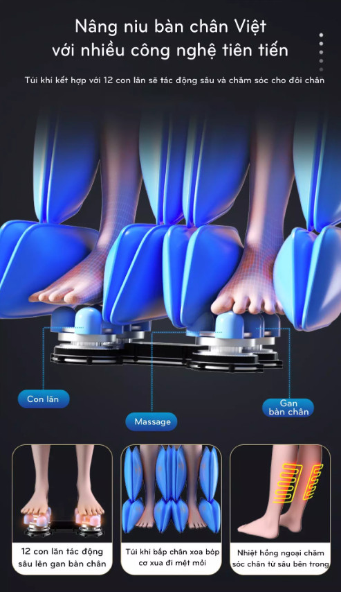 Sản phẩm có 12 con lăn tác động sâu lên gan bàn chân, tích hợp túi khí bắp chân và nhiệt hồng ngoại giúp chăm sóc chân từ sâu bên trong và xoa bóp cơ chân hỗ trợ xua đi mệt mỏi, tăng lưu thông khí huyết.