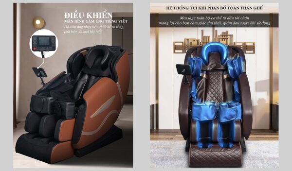 Giao diện màn hình sử dụng hoàn toàn bằng tiếng Việt, người dùng có thể điều chỉnh lực tác động của con lăn và lựa chọn bài tập dễ dàng với bảng điều khiển màn hình LCD cảm ứng. Vì thế, người cao tuổi dễ dàng sử dụng. Trên màn hình sẽ hiển thị các chế độ, chức năng của ghế massage. Bạn chỉ cần thao tác đơn giản với bảng điều khiển và tận hưởng massage.